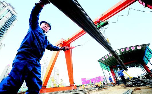 近日,在武汉地铁3号线市民中心站施工现场,一名工人正指挥龙门吊实施钢筋吊装。空地上,钢筋切割溅起的片片火花,在寒风中快乐闪跃。