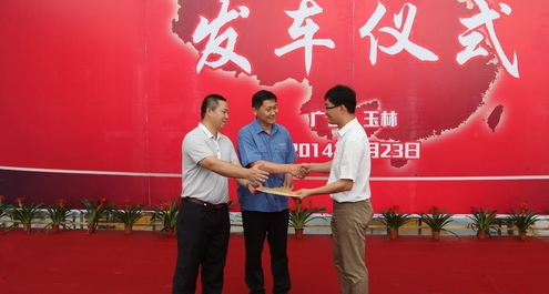 仪式最后,在隆重的音乐和礼炮声中,张士勇以及代理商广西嘉力公司徐亮向广西水利厅交付了代表项目设备的“金钥匙”,38台挖掘机设备正式发运。