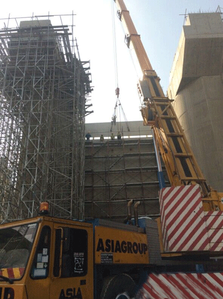 马来西亚胡鲁电站溢洪道共有三孔弧门,每孔弧门高度为17米,宽度为11米,共七节,总重120吨。由于前期制造、运输等工期滞后,三套弧门分别只有一个月的安装时间,再加上与土建的交叉施工,工程师及当地安全部门的监督管理,给现场施工及吊装工作带来较大难度和影响。