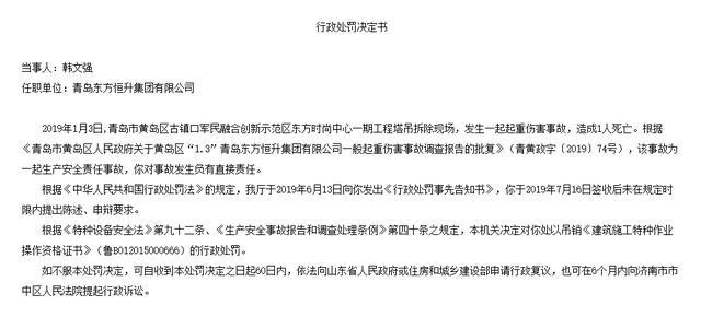 其中,鲁建罚字〔2019〕35号行政处罚决定书当事人青岛东方恒升集团有限公司,行政处罚决定书显示:2019年1月3日,青岛市古镇口军民融合创新示范区东方时尚中心一期工程塔吊拆除现场,发生一起起重伤害事故,造成1人死亡。根据《青岛市黄岛区人民政府关于黄岛区“1.3”青岛东方恒升集团有限公司一般起重伤害事故调查报告的批复》(青黄政字〔2019〕74号),该事故为一起生产安全责任事故,青岛东方恒升集团有限公司对事故发生负有主要责任。