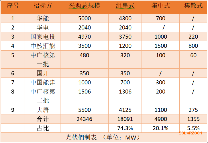 光伏們统计了2020年上半年的电力央企招标,在共计24.3GW的招标中,组串式容量超过了18GW,占总招标容量的74.3%。