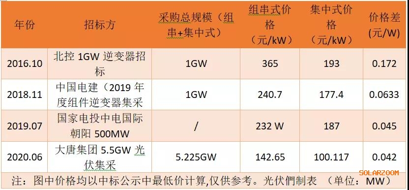 如上文所述,从集中式与组串式逆变器的价格来看,二者价差正逐步缩小,尤其是近五年,多次逆变器格局变动和531政策以及海外市场的激烈竞争等因素给逆变器的价格竞争带来了持续的压力。光伏們对比了2012-2020年的重点招标项目,其中对中标候选人或者中标公示人的逆变器价格进行了对比,可以发现,集中式与组串式逆变器的价差正由2016年的0.17元/瓦逐渐缩小至不足5分钱。