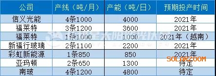 据北极星太阳能光伏网不完全统计,2021年光伏玻璃企业将有11650t/d产线投产。其中,福莱特将有3条1200t/d,1条1000t/d的越南产线投产,信义在芜湖将有4条1000t/d产能,新福兴将有2条11000t/d产能,不过窑炉存在一定爬坡期,下半年产线贡献相对较小,预计光伏玻璃将在2022年释放,这也意味着,2021年光伏玻璃供应将持续紧张。
