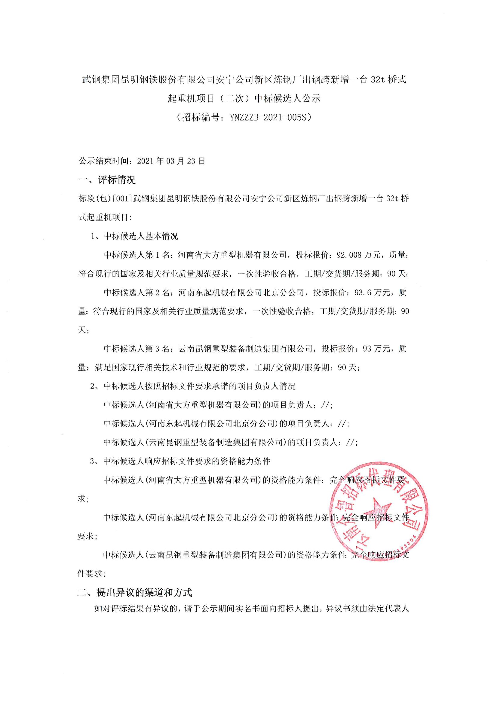 武钢集团昆明钢铁股份有限公司安宁公司新区炼钢厂出钢跨新增一台32t桥式起重机项目(二次)中标候选人公示 SWF文件链接