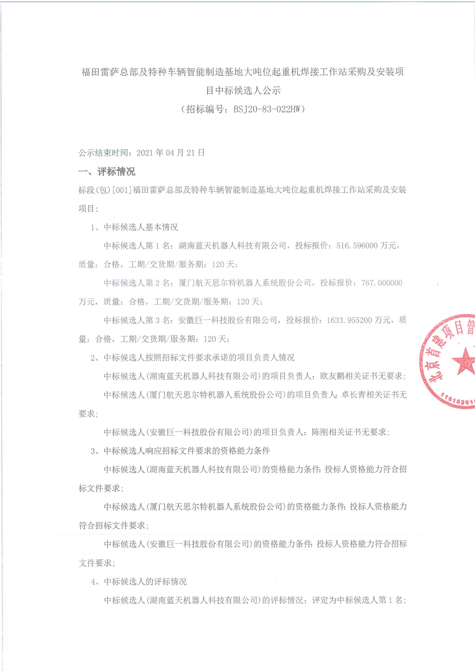 福田雷萨总部及特种车辆智能制造基地大吨位起重机焊接工作站采购及安装项目中标候选人公示 SWF文件链接