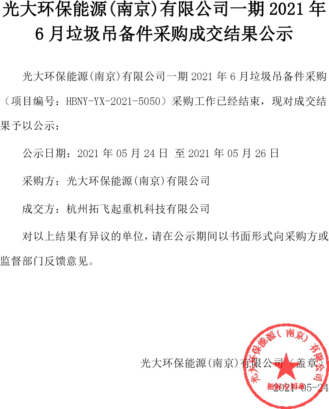 光大环保能源(南京)有限公司一期2021年6月垃圾吊备件采购成交结果公示